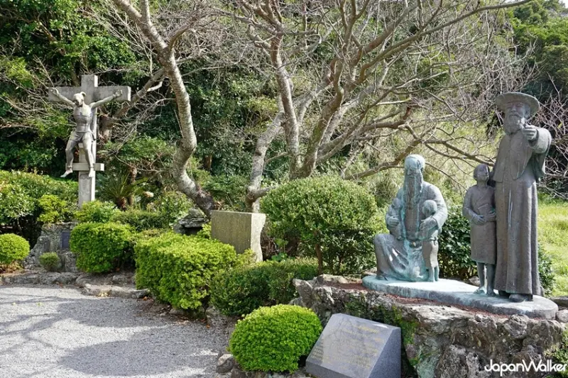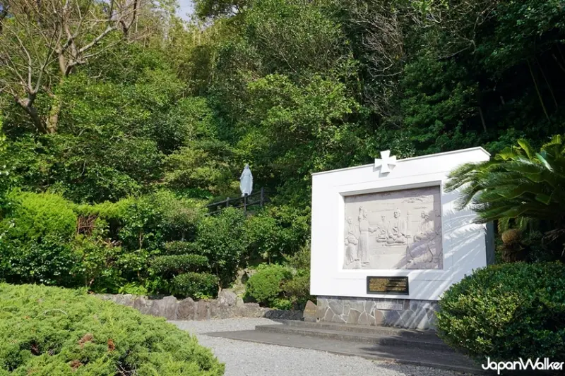 ▲教堂外庭院的聖母雕像及立面浮雕,浮雕上描繪的是16世紀傳教士アルメイダ和日本修道士ロレンソ來五島傳教的場景。
