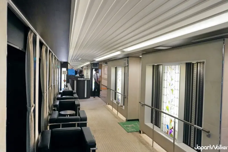 ▲時髦感十足的登船穿廊,指定客席的旅客在櫃檯領取房間鑰匙。