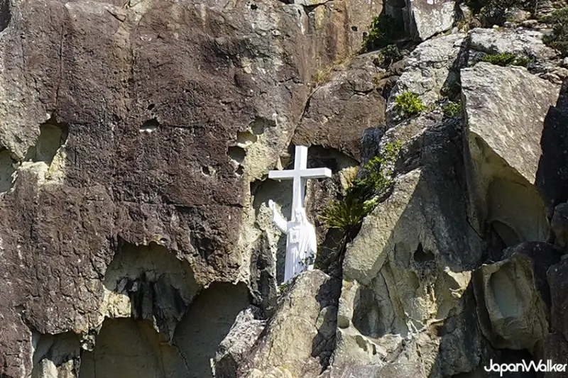 ▲白色基督像與十字架立在海邊陡峭的懸崖峭壁上,洞窟的隱密性高可以想見當年的天主教徒為何躲藏在這。