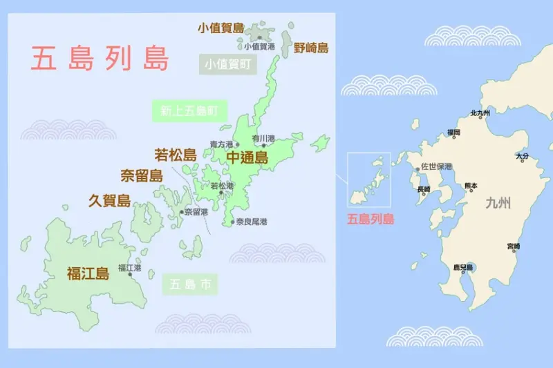 五島列島於九州長崎縣最西端,由5個主要島嶼及附屬小島組成,東北西南向排列於長崎外海。面積最大的福江島,與久賀島、奈留島合為「五島市」,若松島、中通島則為「新上五島町」,最北還有小值賀島、野崎島則屬「小值賀町」,天然景觀豐富、純樸自然是五島最美的景色。