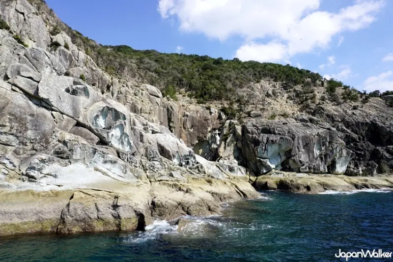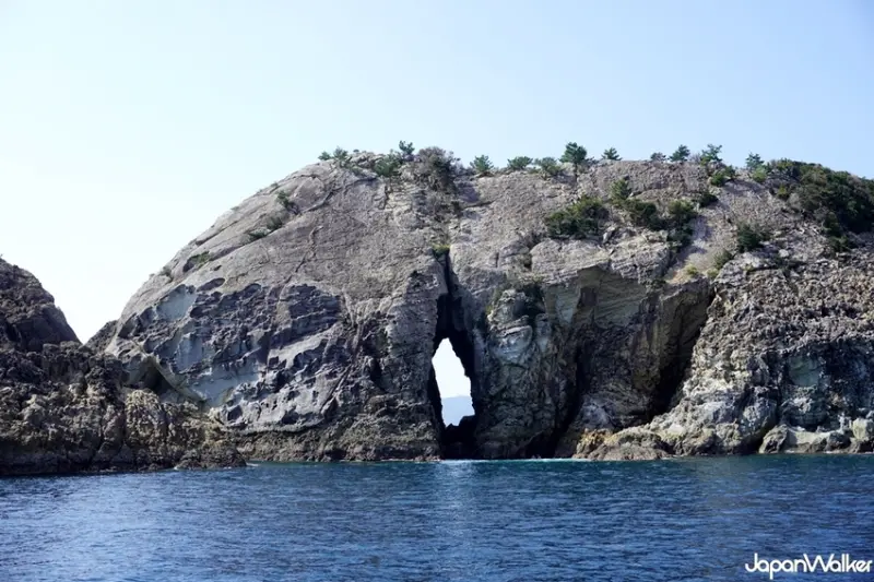 ▲從海上望向「ハリノメンド」,洞口輪廓彷彿聖母瑪麗亞抱著嬰兒般的樣子。