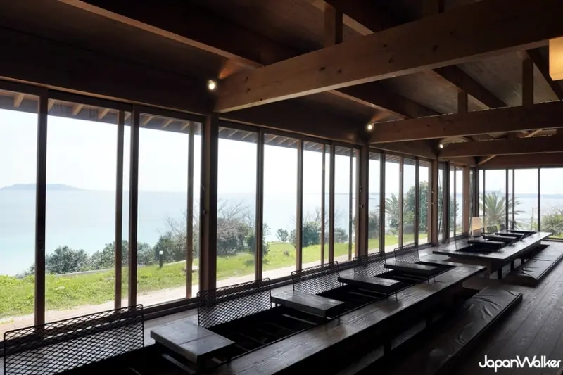 位以戲水聞名的香珠子海水浴場旁的小山丘,穿過椿花樹(山茶花樹)叢小徑而上映入眼簾的是由古民家改建的「椿茶屋」,為當地相當有人氣的預約制圍爐燒烤餐廳,去年11月關閉整修,於今年6月重新開幕,煥然一新的木造老房,不變的是屋內兩面落地窗牆向外望出的五島海景,伴你享用美味的餐點。