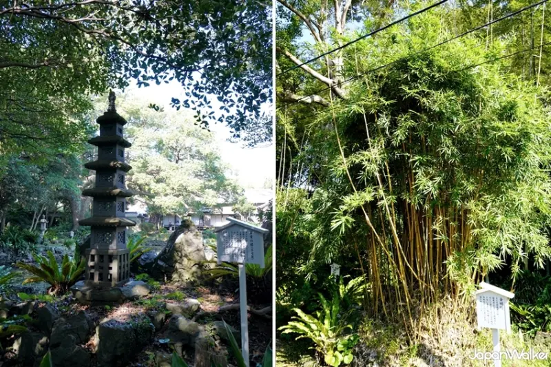 ▲「五重の塔」(左)是為紀念第20代五島藩主於1594年朝鮮戰役中獲勝而造的石燈籠。「金明竹」(右)由中國福建移植過來,枝幹金黃竹葉翠綠,妝點園中更添韻味。