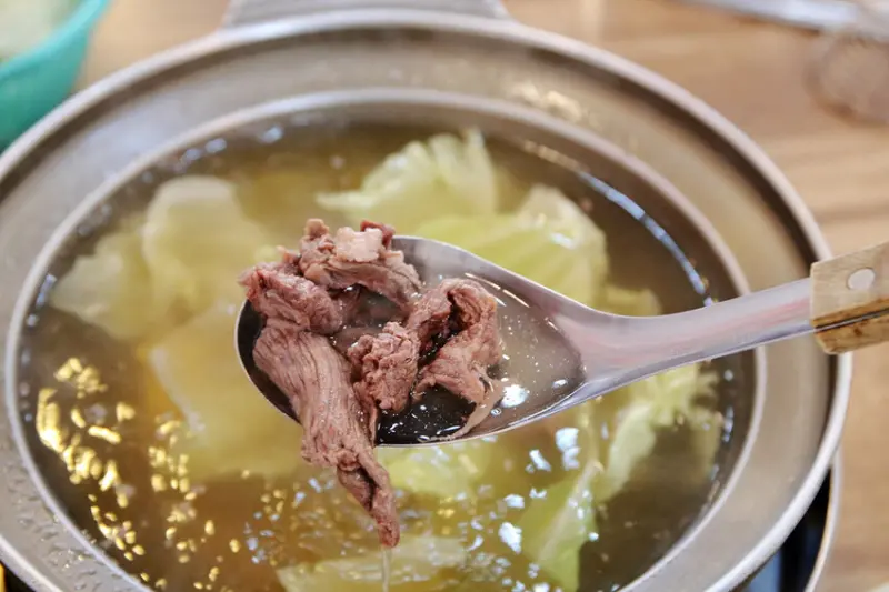 牛肉火鍋用的可是本土現宰的溫體牛,直接下鍋涮個幾秒就可以吃了喔!輕涮3-4秒,肉片呈現略帶粉嫩狀的口感是最好吃的,入口可以吃到牛肉的嫩度與清甜感,軟嫩又甘甜,在台南能吃到這麼好吃的溫體牛肉真的是太幸福了〜〜〜