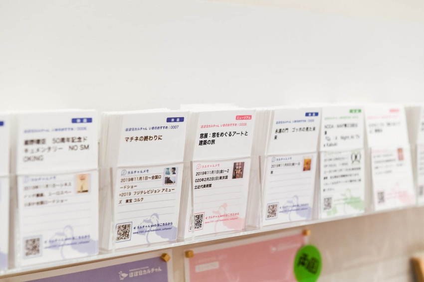 開設於澀谷PARCO 4樓的「ほぼ日カルチャん」,以「每一天的東京特輯」為主題,打造充滿ほぼ日風格的「東京文化案內所」,以「ほぼ日」的視角,嚴選東京各地每天舉辦的各種舞台、電影、演唱會、展覽等活動,工作人員還會化身導覽員,介紹當下最in的東京有趣文化。店內也會放置各個活動的DM、宣傳手冊可索取。