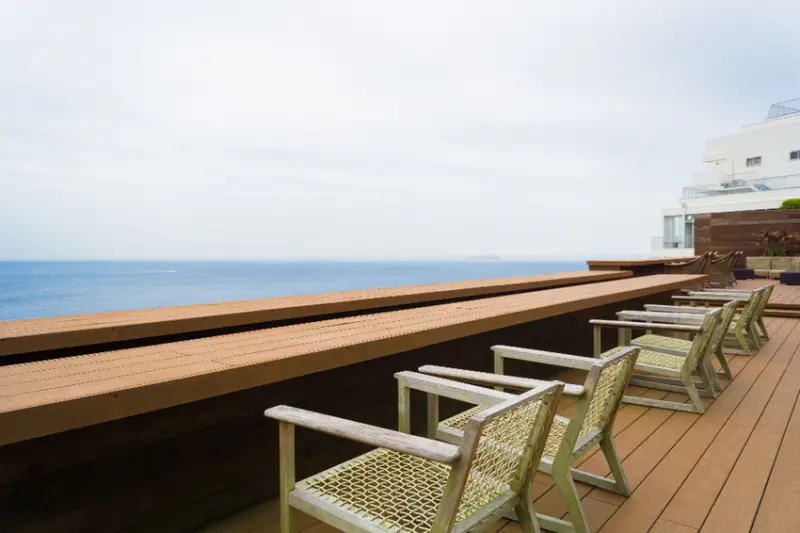 ▲本館5樓的紺碧露天陽台,可飽覽一望無際的蔚藍大海。