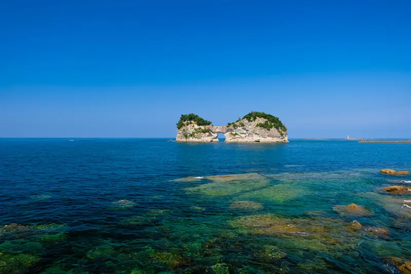浮現於白濱海上的圓月島,正式名稱為高嶋,是一南北長130公尺、東西寬35公尺、高25公尺的岩石小島。在海水侵蝕下,島中央剛好形成一圓洞,狀似圓月,每年在春分、秋分時期,能看到夕陽恰好從圓洞中沉入海面的奇蹟畫面,也讓圓月島獲選為「日本夕陽百選」,是許多人挑戰想要拍攝的絕美景致。