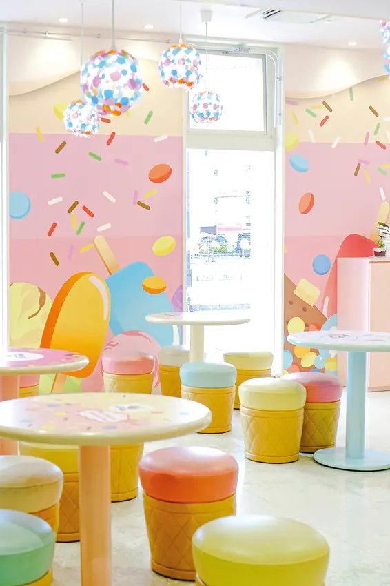 ▲冰淇淋甜筒的座位,繽紛可愛。