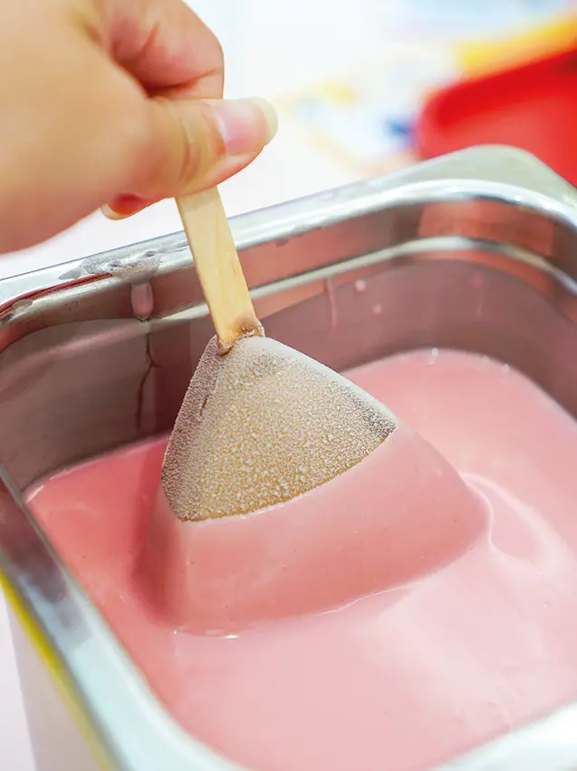 STEP02 挑選喜歡的巧克力醬,將雪糕的表面裹上巧克力醬,製作外層脆皮。
