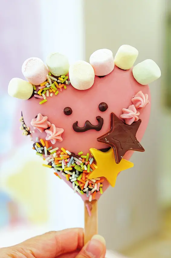 STEP03 使用巧克力醬繪製圖案,貼上棉花糖、其他裝飾等,就完成了。