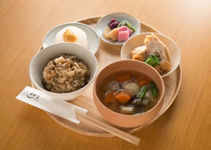 附設的食堂座位以純和式榻榻米,提供各式日式餐點、甜品,可以品嚐到京都樸實的和風美味。「京都定食」以京都傳統野菜、醃菜、白飯搭配三菜一湯,是健康又無負擔的精緻美味。