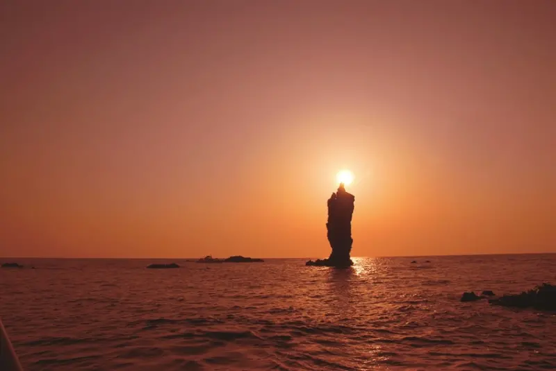 蠟燭島位於島根縣島後島西北岸,是一座由大自然鬼斧神工雕刻的柱狀奇岩,陡然高出海岸線足足有20公尺,形似有著燭芯的蠟燭而得名!每到傍晚,坐上配合日落時分出航的遊覽船,當船慢慢接近蠟燭島時,太陽也隨之漸漸下山,眾人莫不屏息等待落日到達小島的頂端,那一瞬間宛如蠟燭被點亮般如夢似幻,親眼見證機率只有69%的絕景,看過的都說感動,是隱岐最為代表性的景觀。