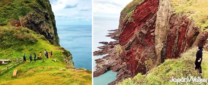 赤壁在當地人口中稱為「Akadaki」,是沿著知夫里島西海岸長約1公里的險峻斷崖,懸崖最高處達200公尺,頂端整片呈現絢麗紅色,十足遼闊且壯觀。其實,懸崖本身是一座碎屑小火山口的橫截面,反覆噴發飛濺的熔岩中富含鐵元素,在高溫時與空氣接觸氧化形成紅咖啡色,才形成如此特別的景致,是知夫村不可不訪的地標。