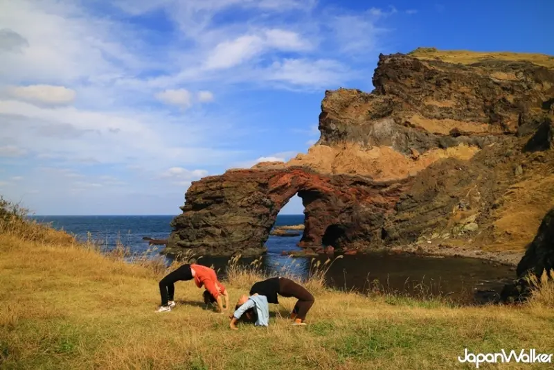 國賀海岸是隱岐諸島內最長的侵蝕海岸,共計13公里長的海岸線展現驚人美景,想要徹底感受一番,最好的方法就是沿著摩天崖遊步道前往遊覽。位於步道一端的通天橋,岩石中心被海水侵蝕而形成高達40公尺的拱型橋,洞口因含鐵質高在陽光下會顯現多變的美麗色彩,堪稱國賀海岸奇岩怪石的代名詞之一,不少人在此擺出各種趣味姿勢拍照,下次換你來試試!