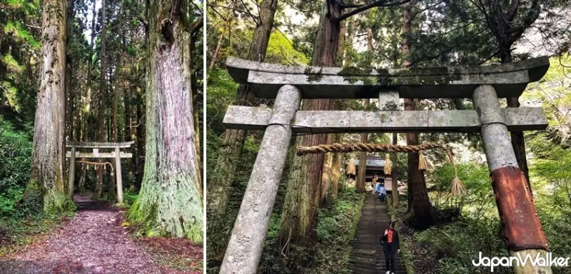 ▲走向神社的參道上建有鳥居,左右兩側有兩棵巨木,稱為壇鏡夫婦杉。壇鏡瀑布又稱為「勝利之水」,當地人會前來此處取山泉水,祈求帶來好運。