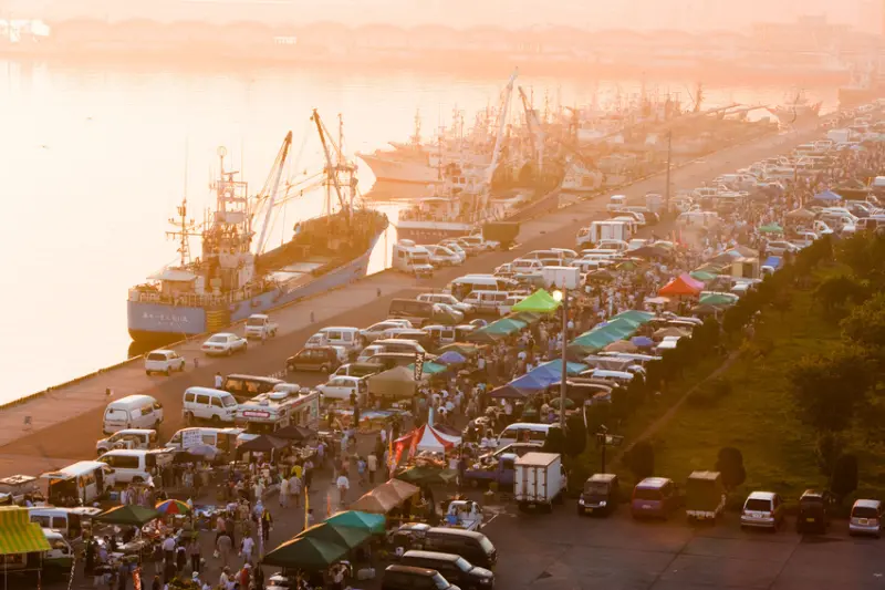 青森八戶市面太平洋的館鼻岸壁,平日只是船隻靜靜停靠、空曠的海港空地, 然而每到周日,便會出現日本最大規模的朝市,集結約300間店家來此擺攤,販售 最新鮮的海產、便宜的蔬果、現做的炊飯 等美味食品,熱鬧非凡。自車站只需步行8分鐘便能抵達,絕對是挖寶、搶好康的絕佳去處。