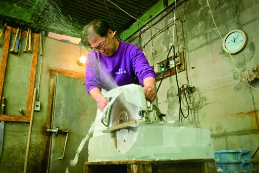 ▲由經驗老道的社長吉新昌夫先生切割刨冰用的冰塊。