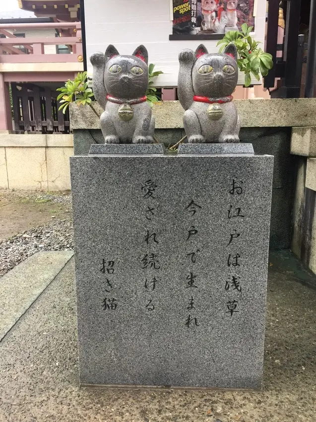 淺草可說是江戶文化的重要寶庫,坐落於此的今戶神社更是招財貓的起源地,一走入神社腹地就可以看到大大小小成對的招財貓。今戶神社主要供奉的神祇除了應神天皇與福祿壽外,最重要的即是日本神話中的第一對夫妻「伊弉諾尊」與「伊弉冉尊」,許多來此參拜的人成功締結良緣,是公認的靈驗神社。