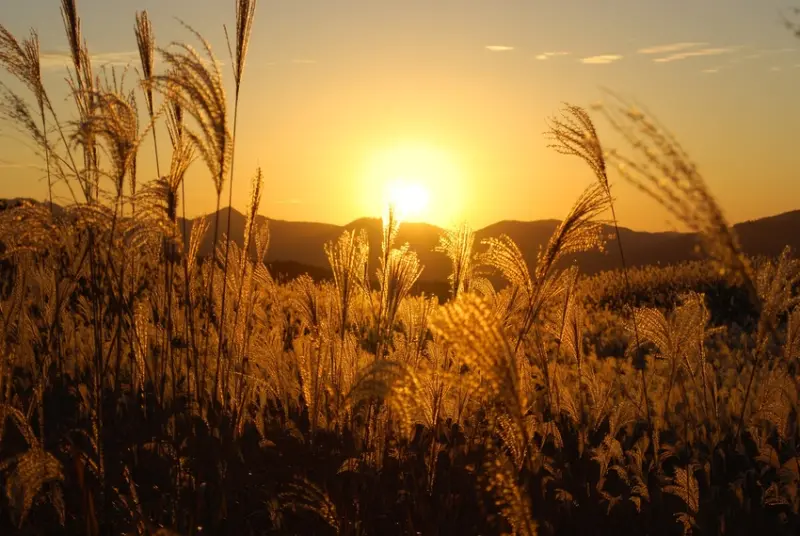 約33個棒球場大小的壯觀芒草田,是奈良時代為種植屋頂建材芒草而成,如今則為秋季欣賞搖曳的芒草絕景之處,獨特美景成為婚紗攝影的人氣景點。山下鄰近有奈良自產啤酒工廠,走遠一點更有溫泉作為踏青之旅的完美句點。