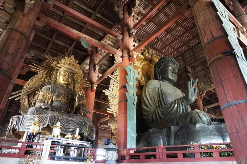 東大寺的大佛殿(金堂)為世界最大的木造古建築,殿內供奉的銅造盧舍那佛約有15公尺高,為奈良最具代表性、最受歡迎的景點之一。東大寺是天平文化下集大化革新後國內8派佛學大成的寺院,除莊嚴的大佛外,殿內諸多佛像與建築本身,都是流傳千年的重要佛教藝術瑰寶。