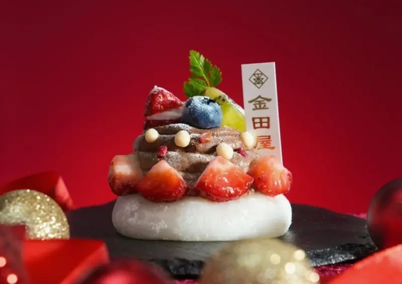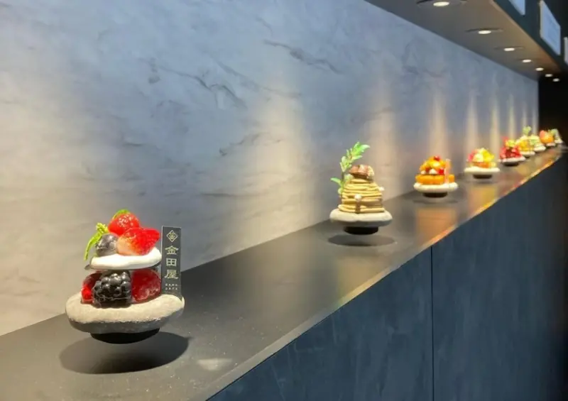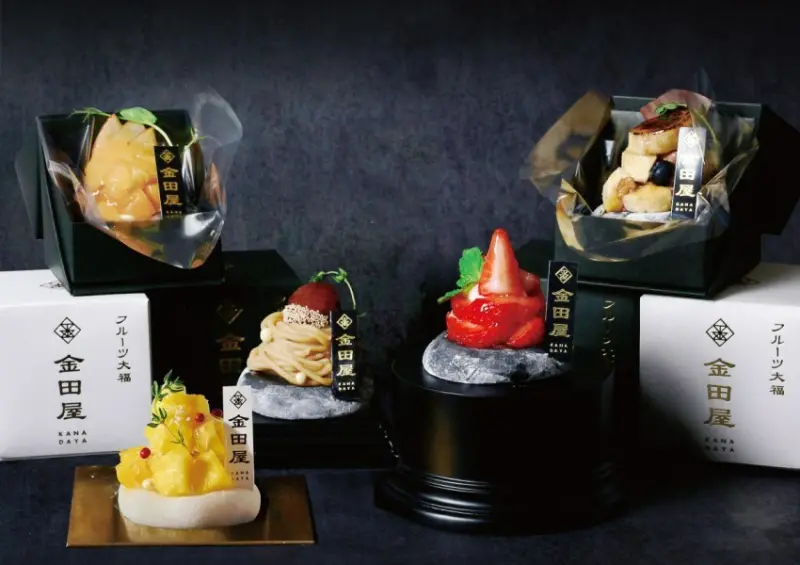 在東京銀座開幕就造成日本人狂打卡的「金田屋」,以新鮮水果大福為主打,是近年東京最夯甜點之一,其特色不僅僅是顛覆傳統將水果包在麻糬、白豆沙裡面,而是將大福擀平後,再上頭用各種水果裝飾,視覺感更加華麗、好打卡。同時,店內更是以漂浮旋轉大福的方式展示,讓走過、路過的人都忍不住停下角度拍照,瞬間引爆日本甜點話題。