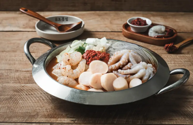 永登浦章魚湯將新鮮長臂章魚和蔬菜拌在一起燉煮。值得一提的是,特製湯底內還加了韓國特產海藻「甘藍菜」,用來提煉其他新鮮食材的美味。3,200日圓。![]()
