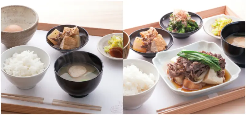 ▲除了豐盛的定食,也有供應到11:00的正統日式早餐,以飯、味噌、生雞蛋、每日小菜、醃漬物5種組成,米飯以傳統的竈炊製而成,特別美味(左)。