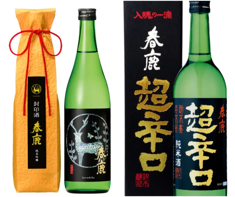 ▲高級的吟釀香氣、彷若絲綢般滑順的秀逸口感堪稱上品的「封印酒」(左),外包裝的設計也融合天平文化的佛教風格,別出心裁令人印象深刻。30年來受到顧客肯定的春鹿代表性商品「純米超辛口」,適合搭配料理,清爽香醇的美味與辛口後味,在歐美市場也大獲好評(右)。(未成年請勿飲酒)