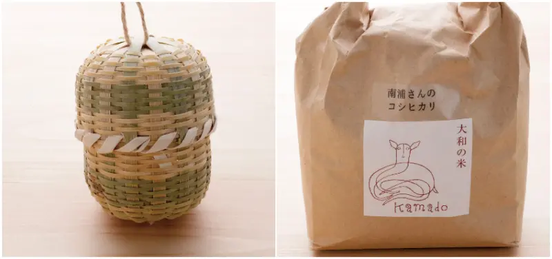 ▲奈良山添村獨特的煮茶用竹製茶籠(左)、奈良縣內的米農都讚不絕口的美味好米(右)都有販售。