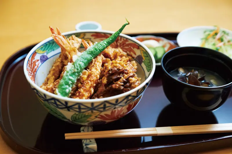 ▲午餐的天婦羅蓋飯包含3條炸蝦、3種野菜與蝦夷盤扇貝等奢華食材,搭配沙拉、味噌湯與必不可少的日式漬物。