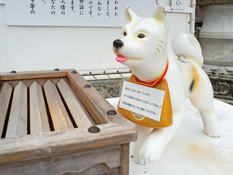 ▲可愛的狗狗其實是抽詩籤的地方,投入¥100就能從狗狗背部抽一支籤,籤上還附有小金狗護身符。