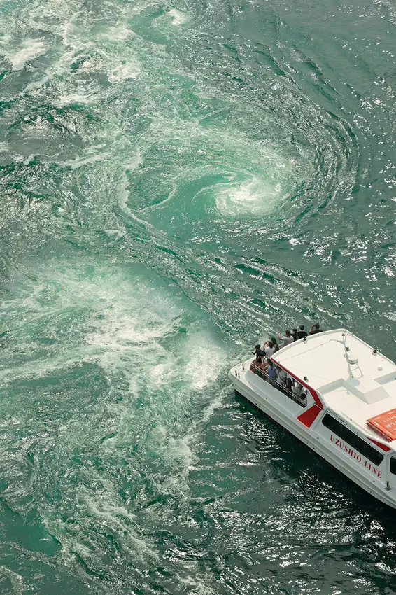 大鳴門橋連結德島鳴門與淡路島 ,分為2層,上層行車、下層行人,總長1629公尺的大橋共有450公尺設有行人步道,行走其中能從海拔45公尺處向下欣賞海中奇景,也就是世界最大規模的漩渦。因鳴門海峽地形突然窄縮,使急速的海流無處可去,因而形成震撼景致,是德島必訪景點。