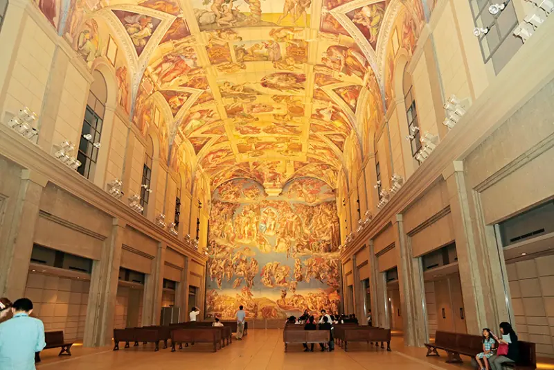 ▲入口兩層樓高的西斯汀禮拜堂天井畫與壁畫,細緻的彩繪手法還原真品的震撼感。