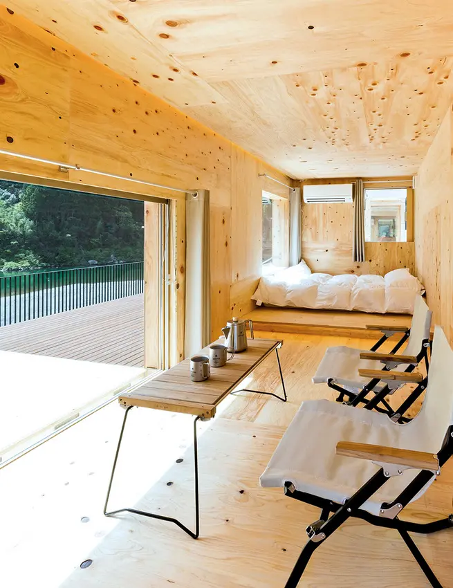 ▲河畔上排列的木造「住箱」,是Snow Peak與隈研吾聯手開發的特有住宿空間。