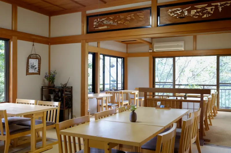 位在下千本的日式餐廳,以「品味吉野」為宗旨,所有的套餐內都有使用當地特產吉野葛所烹飪的料理,及在地當季食材,如山菜、花鯰魚、野豬等,從料理中能感受吉野的季節,裝料理的缽碗皆是店主為搭配料理精心挑選。從座位還能看見窗外四季景緻,感受季節變化。