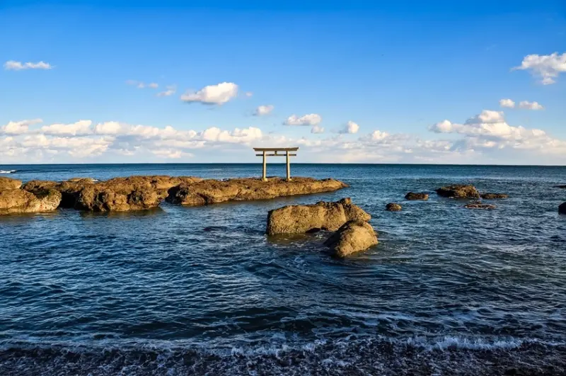 佇立在礁石上的海上鳥居美景「大洗磯前神社」