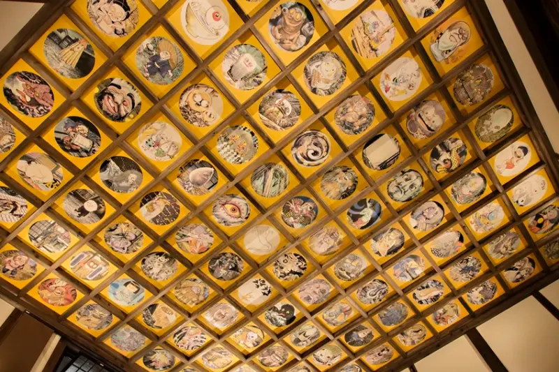大山寺創建於江戶時代,原有42個支院,一度於明治時代沒落,圓流院為如今僅存的支院之一,在重建時特別增添了108幅出自《鬼太郎》作者水木茂之手的妖怪天井畫,訪客可以在參拜後橫躺在殿中慢慢欣賞。