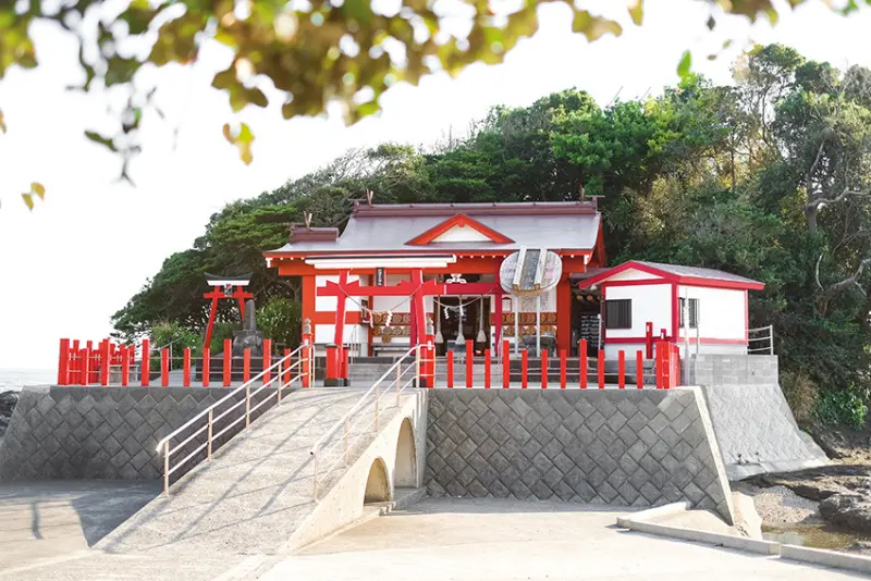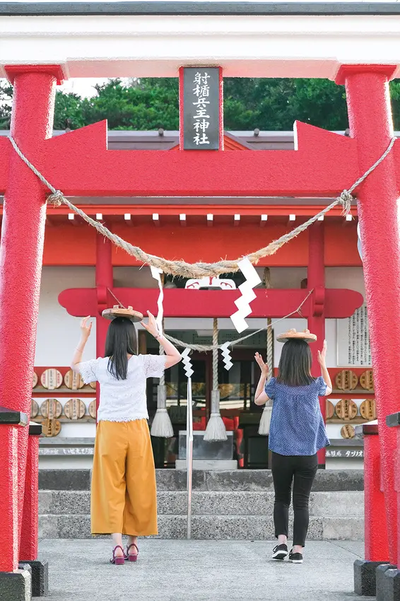 坐鎮海岸突出岩礁上,射楯兵主神社供奉的是日本神話中的武神,因此吸引許多期望武運昌隆的運動選手、藝人前來參拜,成為著名的話題神社。有別於其他神社,相傳祈願時只要在頭上戴上釜鍋蓋,從鳥居走到神社本殿都沒有掉落,願望便能實現,也因此神社別名有稱「釜蓋神社」。
