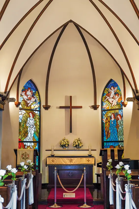 ▲蝙蝠形的天花板配合聖母的彩繪玻璃窗,營造歐洲大教堂的氛圍。
