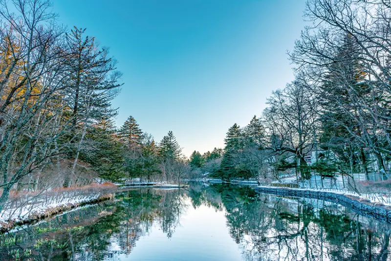 輕井澤山林茂密,雖沒有海,卻有絕色的山林和湖景,其中雲場池就是能飽覽四季絕景的湖泊。別名「天鵝湖」的雲場池,以初夏的新綠、秋天的紅葉和冬天的雪景而聞名,茂密的林木和雪白的浮雲倒映在湛藍的湖面上,猶如一幅絕色畫作。不少人會騎自行車前來雲場池入口,然後走路繞池一周,沿途可見鴨子一頭栽進池裡覓食,也能近看和遠觀周邊的生態植物。此外,此處湧出的泉水水質良好,從江戶時代開始已是達官貴人的飲用水,就連明治天皇造訪時也曾飲用,因此亦有「御膳水」的美譽。