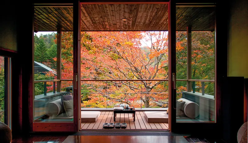 ▲入秋後,打開房間的窗戶就能看到盛開的紅葉。