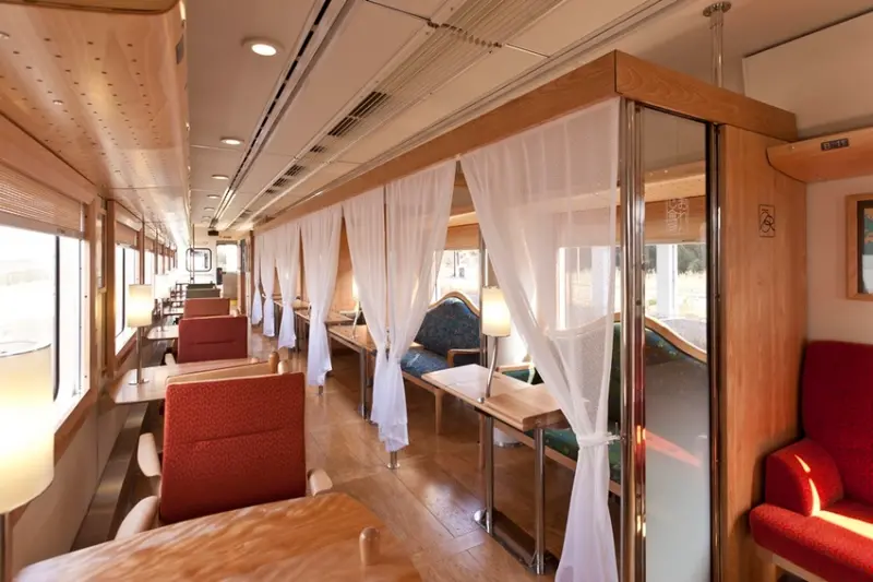 為配合JR九州新幹線動工,接手經營起鹿兒島川內站一 路向北到熊本八代站路段的肥薩おれんじ鉄道,由南向北 沿著九州西海岸行駛,2013年推出的觀光列 車「おれんじ食堂(橙食堂)」,請列車設計大師水戶岡鋭治操刀,宛如頂級飯店大廳、高檔餐廳的設計加上車內提供餐點傳來的陣陣飄香,期望透過當地的食材、料理打造奢華的餐車體驗。在享受美食之餘,窗外輕緩流逝的九州西海岸美景,也是必賞重點。