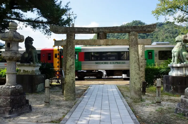 ▲列車穿過神社腹地呼囂而過,是佐賀人津津樂道的珍奇景致。