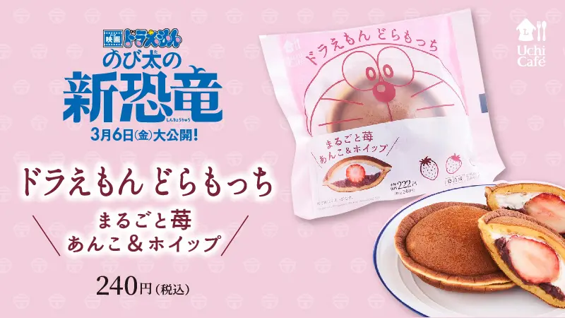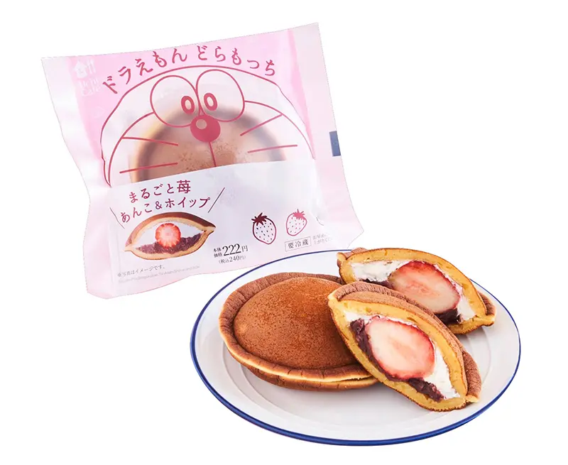 ▲3/6上市的草莓紅豆銅鑼燒(¥240),哆啦A夢最愛的銅鑼燒夾入一顆完整草莓,化身夢幻甜點。