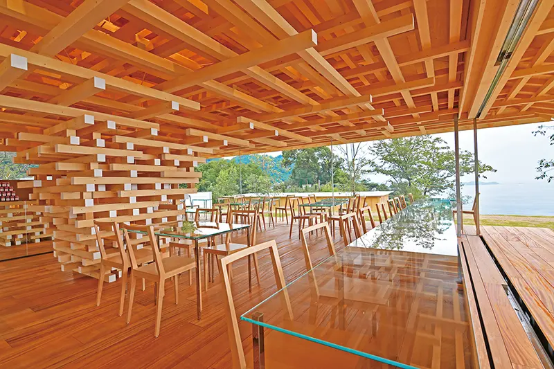 使用了1000多根木條,以榫卯的手法從地面堆疊、延展至天花板,營造宛如一顆大樹般的視覺結構,搭配四面皆為透明的玻璃牆,整間咖啡館遠看就像從地面茂然崛起一般,和諧地和周圍景致並存共生。另外,使用來自伊豆牧場的鮮乳製成的玫瑰冰淇淋和伊豆柑橘蜂蜜年輪蛋糕都是店內限定人氣Menu!