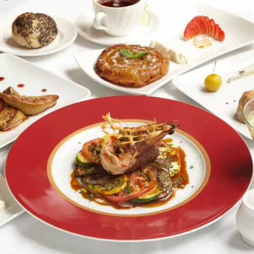 2011/10才開幕,就已經吸引許多政商名流前來用餐,偶像劇「小資女孩向前衝」也前來取景,其中溫昇豪說的幾句法文也是跟Stephanie學好久才學會的呢!至於店裡的餐點真的是精緻奢華,圖中以紅邊餐盤盛裝主菜的是「皇家套餐」,有開胃小菜(韃靼生牛肉)、皇家開胃香檳酒、法式私房麵包、當日濃湯(蔬菜濃湯)、梨和薑火燴肥鵝肝、腓力牛排佐赤(馬丁尼)酒蝦、金板輕衣魚佐精緻香料、法國蝴蝶洛克福乳酪搭核桃麵包、精選甜點、飲料。以韃靼生牛肉而言,小編從來不愛吃生食,連生魚片也不吃,不過這開胃小菜不腥不油,香料用得剛剛好,算是成功改變了小編對生食的印象。至於層次分明的鵝肝真的是好吃到小編的舌頭都要掉出來了!!表面的胡椒引出清雅的口感,外皮全熟但咬下去的柔嫩口感令人欲罷不能。精選甜點真的是非常精選,一整份的蘋果派配上打發鮮奶油,草莓切片刀工真厲害,竟然可以切成15片呢!