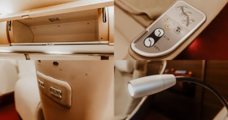 座位上方有置物處,可以善用扶手上的按鈕調整到讓自己舒服的角度,閱讀燈一轉即開,座椅扶手處備有充電設施非常貼心。