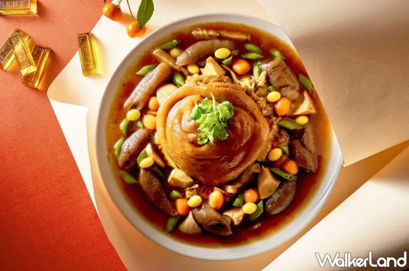 ▲「蟲草花膠雲吞雞」象徵團圓美滿;「八寶紅燴金元蹄」寓意財富滿盈 / 六福萬怡提供、WalkerLand窩客島整理