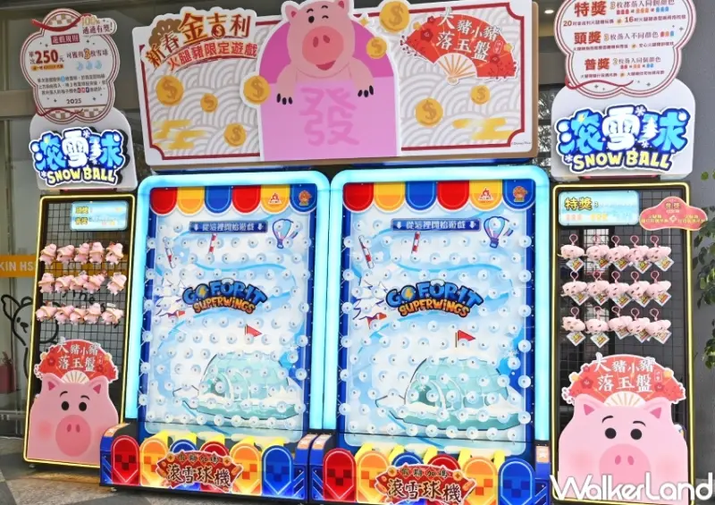 第三款扭蛋機則是春節加碼玩法「金吉利滾雪球機」,每次將獲得3枚雪球進行遊戲,根據雪球落入格子顏色兌換獎品。活動獎品象徵財源滾滾,包括20吋金吉利火腿豬玩偶、火腿豬造型靠枕與隨行玩偶吊飾,過年放在客廳超應景。