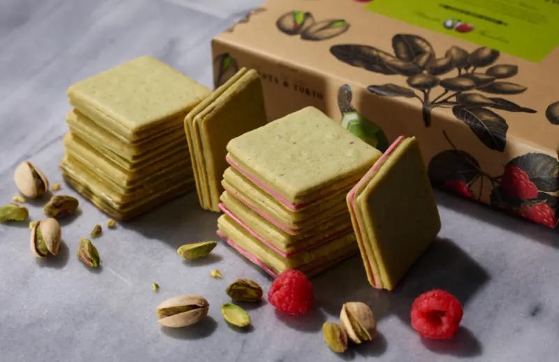 共有兩種風味夾心餅乾,分別為「Pistachio & Pistachio」以開心果風味巧克力與餅乾打造的五層夾心,及「Pistachio & Framboise」將開心果的溫潤與覆盆子的酸甜完美結合,不管是哪一款都讓人愛不釋手。